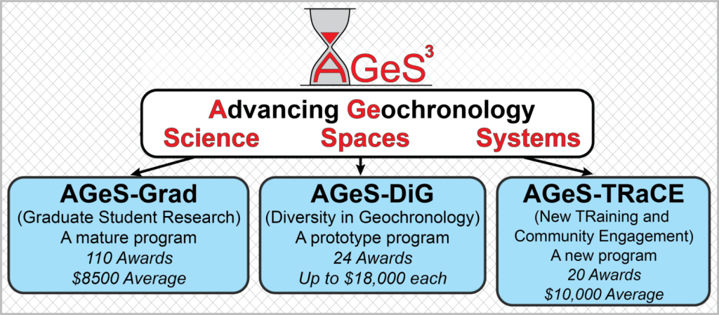 Flowers, R., Arrowsmith, R., McConnell, V., Metcalf, J., Rittenour, T., and Schoene, B., 2018, The AGeS2 (Awards for Geochronology Student research 2) Program: Supporting Community Geochronology Needs and Interdisciplinary Science: GSA Today, doi: 10.1130/GSATG392GW.1.