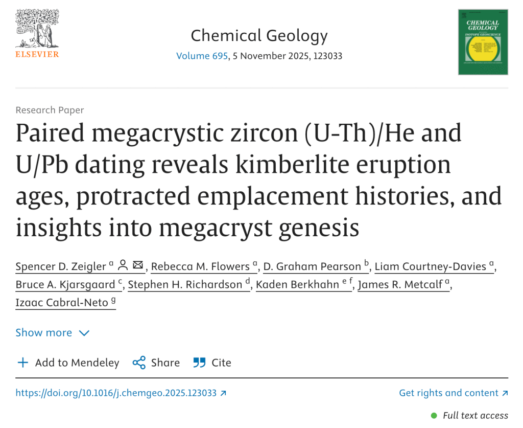 Paired megacrystic zircon (U-Th)/He and U/Pb dating reveals kimberlite eruption ages, protracted emplacement histories, and insights into megacryst genesis, Chemical Geology, Volume 695, doi.org/10.1016/j.chemgeo.2025.123033.