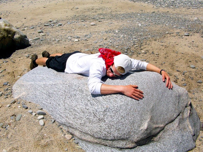 Wes Weisberg posing with the McClure Mountain Syenite standard boulder.